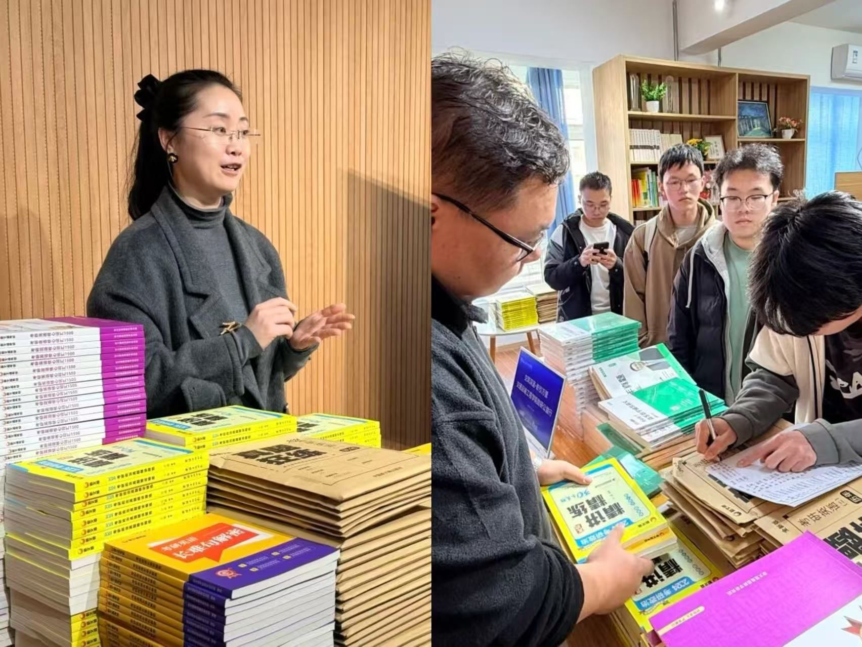 考研学生们有序领取教辅资料。此次发放的150余份考研材料,内容丰富、针对性强,涵盖了考研政治、英语、数学等多个科目。学生们纷纷表示这些资料犹如“及时雨”,为他们备考提供了有力的帮助。
