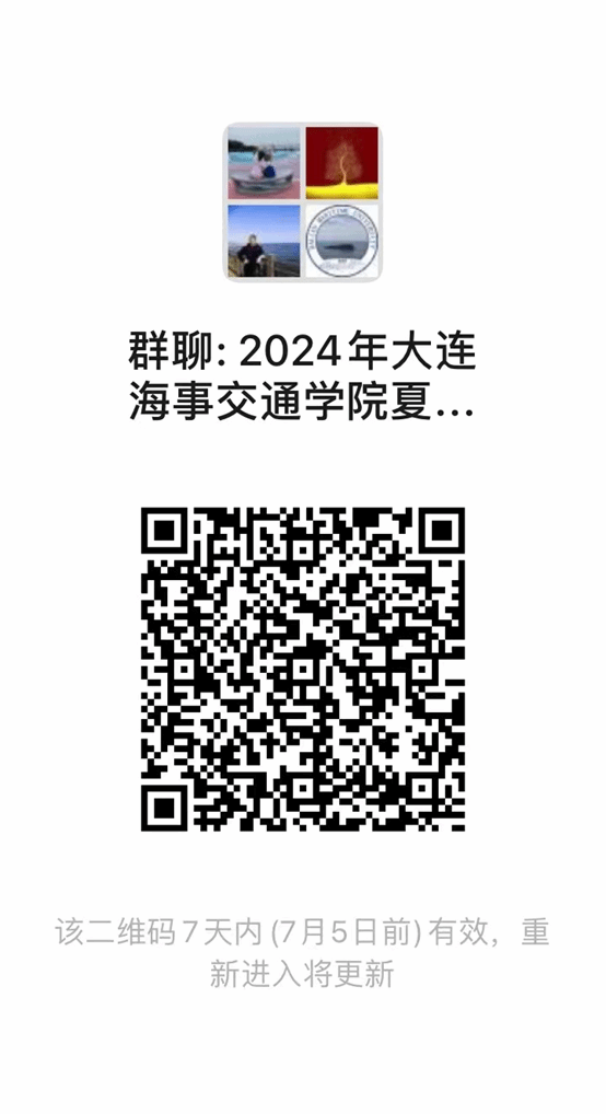 经个人申报,学院审核等程序,现将大连海事大学交通运输工程学院2024年优秀大学生学术夏令营入营名单进行公示(详见附件)。 请名单中的营员于6月28日下午17点前通过扫码加入“2024年大连海事交通学院夏令营群”并在群中通过接龙的方式确认是否能够按时入营以及是否需要安排住宿,逾期未入群确认的视为自动放弃入营资格。入营的营员请及时关注群消息,夏令营活动具体安排将在夏令营活动群通知。