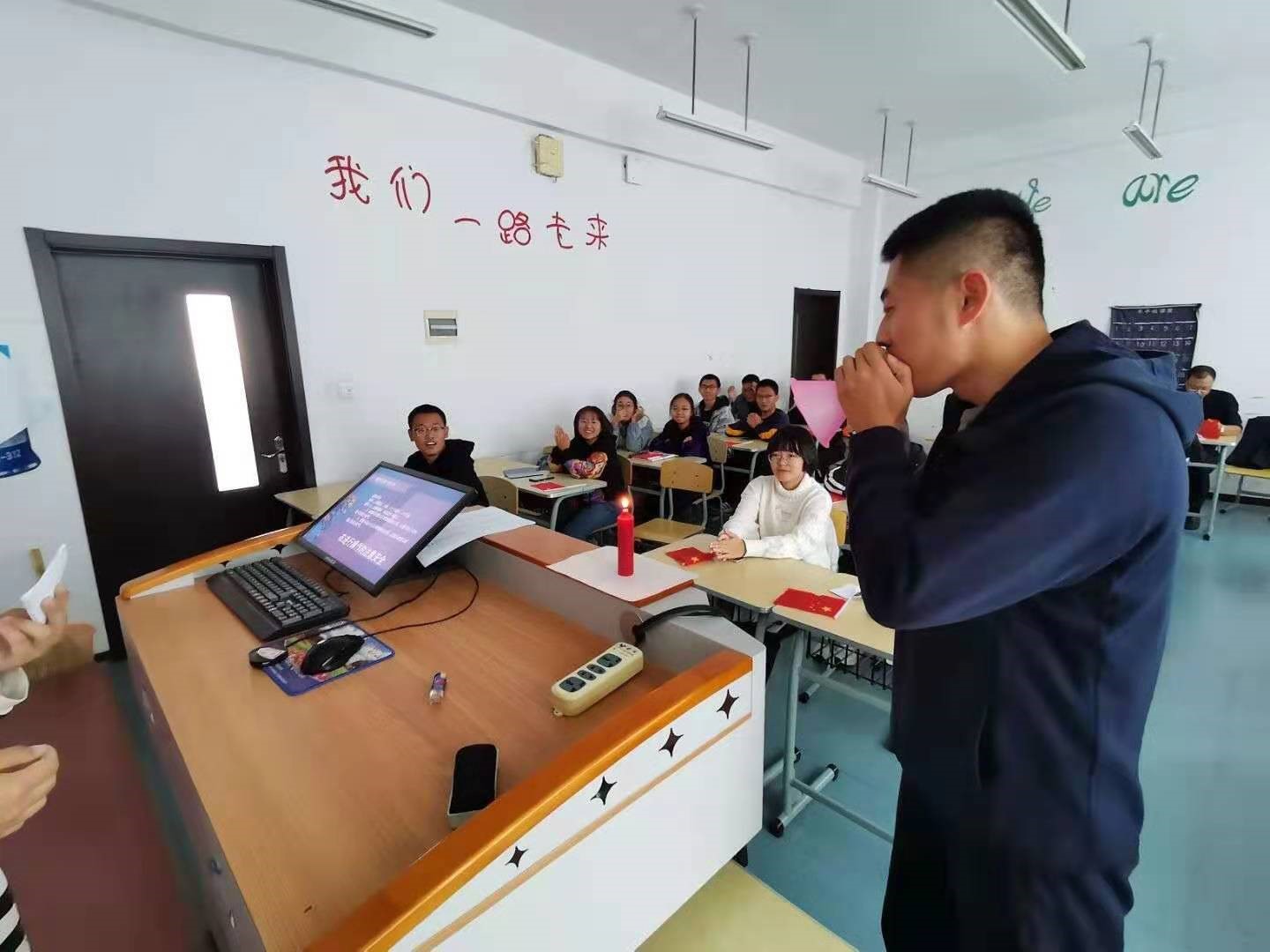 在长征路上,首先,沈骏一同学为大家讲述了红军四渡赤水的故事,同时又领大家一同观看了红军四渡赤水的路线图,展现红军求真务实的优良作风和奇兵神勇的英雄气概。不仅如此,刘杰和姜昊指导员依次上台参加“吹蜡烛”趣味实验,真切地感受到了革命之火永不熄灭。