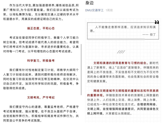 发表两篇综合新闻与四篇公众号推文。交通运输工程学院及时对活动工作进行阶段性总结,并向大众汇报活动成果,有效调动了学生参与活动的积极性,同时亦有利于工作的持续开展。