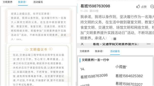 在易班APP上开展“文明素养签名墙”活动。交通运输工程学院借助新兴平台,指引正确导向。普及文明素养知识,同时鼓励同学们做出承诺、留言签名,以此帮助同学们见证自己的成长,鞭策自己成为具有正确文明观的交通人。